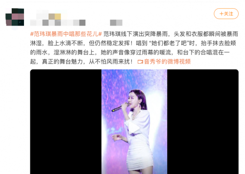 近日,范玮琪在“超音星光”巨星演唱会的演出现场,遭遇极端天气,范玮琪刚刚登台演唱,突遇暴雨,舞台上,很快形成积水,范玮琪的演出服在短短几分钟内就被完全湿透,水珠不断从她的脸颊、手臂滑落。