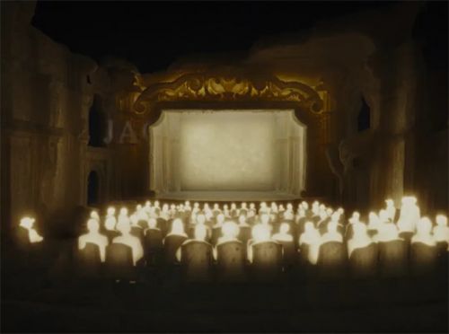 “迷魂者”的故事全部结束后,一群发着光亮的观众陆续走进如圣殿般的蜡烛剧院,伴随电影从放映到结束,剧院逐渐燃烧殆尽,观众也逐渐融化消失。