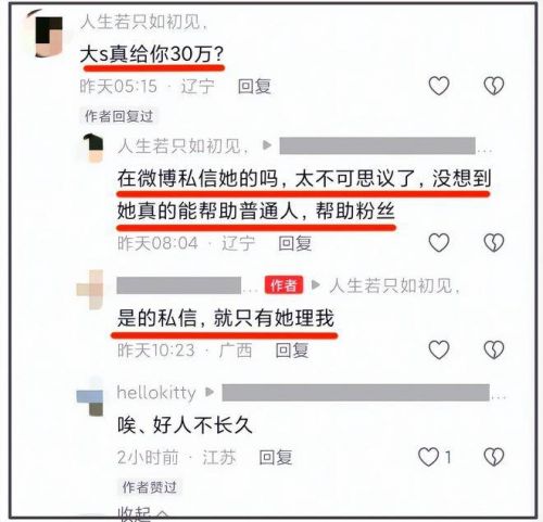 日前,一位博主爆料自己女儿患上白血病时,曾私信求助了多位公众人物,但只有大S帮助了她,并且给了她30万元。不止如此,大S还表示并不需要这位网友宣传,真正做到了做好事但不求回报。