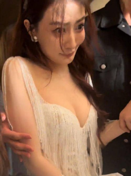你说她这身透视礼服本来就够大胆了,胸前那块纱薄得跟没穿似的,走光风险拉满。