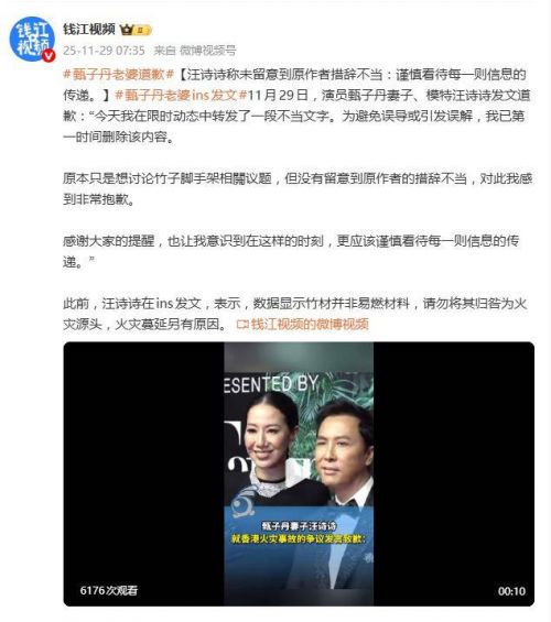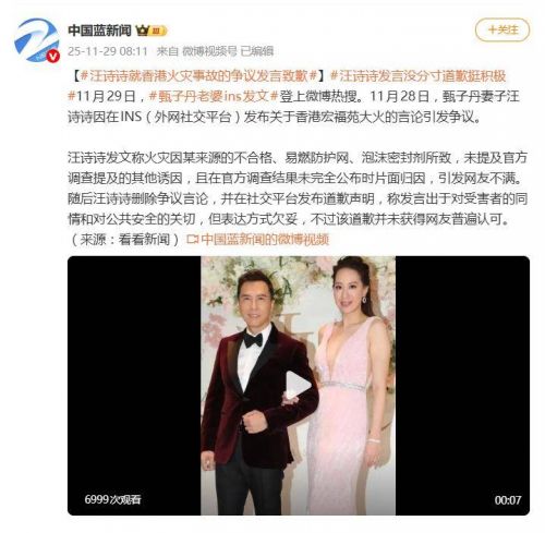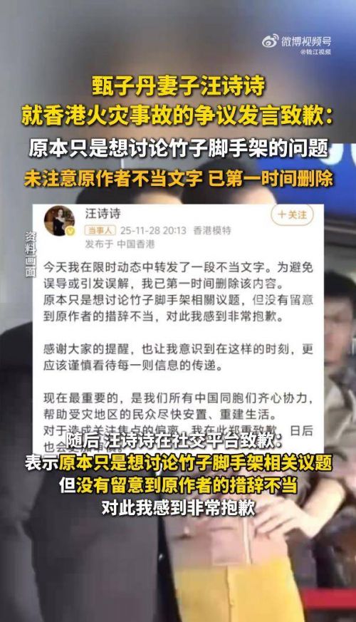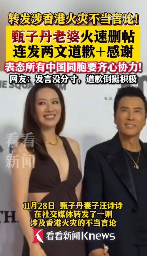 11月29日,演员甄子丹的妻子、模特汪诗诗突然在社交平台发文道歉,瞬间登上热搜,引发全网围观。这场风波的起因,竟是她此前针对香港宏福苑大火发表的一段争议言论。