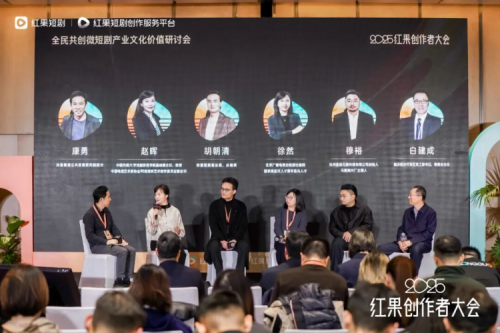 圆桌对话环节汇聚多方智慧,共同探索微短剧产业前行的路径。白建成与抖音集团公共政策研究院院长康勇,中国传媒大学视听艺术研究中心主任、教授,中国网络视听协会微短剧工委会副秘书长赵晖,容量短剧副总裁、总编辑胡朝清,北京广播电视台燃剧社首席编剧徐然,星链无限有限公司创始人、《盛夏芬德拉》导演穆裕等学界、创作机构及产业基地代表,围绕产业论与创作论两大核心议题展开深度交流,分享各自领域的实践思考与独到见解,通过思想碰撞,提供微短剧产业发展多元视角,推动微短剧生态的持续繁荣。