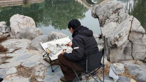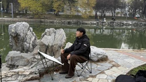 深秋的龙潭公园,林木疏影横斜,湖面波光粼粼,一位青年画家坐在湖畔,手持毛笔,凝视着眼前的景色。他的画笔在宣纸上轻轻落下,墨色渐渐晕开,勾勒出龙潭的秋日神韵。