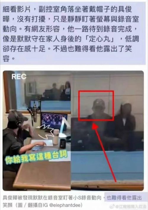 台媒报道,小S在录制跨年宣传片的时候,其实姐夫具俊晔一直陪伴在她身边。副控室角落坐着戴帽子的具俊晔,没有打扰,只是静静盯着荧幕与录音室。有网友形容,他一路待到录音结束,像是默默守在家人身后的定心丸,低调却存在感十足,不过他偶尔也会露出笑容。
