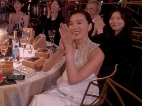 李政宰站在台上发表获奖感言,她开心地坐在台下鼓掌。