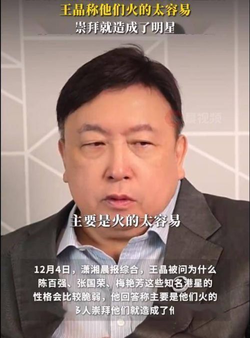 12月4日潇湘晨报综合报道,有人问他为啥陈百强、张国荣、梅艳芳这些港星性格显得脆弱,王晶张嘴就来:“主要是火得太容易,被人崇拜多了就任性,觉得自己啥都好,做不到事就想不通,又没人开解。”
