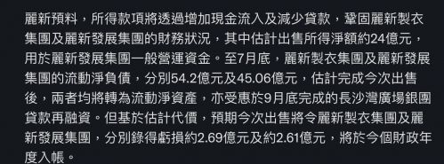 香港富商林建岳旗下的丽新发展早几个月因为有一笔35亿的债务到期,由于一开始找不到有效的解决办法,一度打算将丽新发展旗下的物业出售套现,或是出售股权,以此偿还债务。其中由