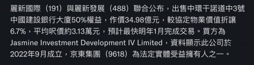 林建岳旗下集团所持有的中国建设银行大厦位于中环干诺道3号,丽新发展持有一半的业权,另一半的业权在建设银行手上。丽新发展自从上半年传出了财困问题后,要出售该物业五成权益的传闻此起彼伏,而买家也各有不同,林建岳对此一直不置可否,如今也总算一锤定音,买家为内地企业京东。丽新发展最新发布的通告称,出售的协定价为34.98亿,在出售这个大厦的业权,并且偿还相关贷款后,将会套现24亿的现金,这大大缓解了负债压力。