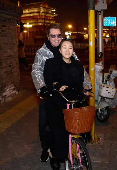 坐在自行车前座上的巩俐,依偎在法国老公怀里,小女人一般的甜腻。夫妻俩咧开嘴开怀大笑的样子,就像刚谈恋爱的年轻人。