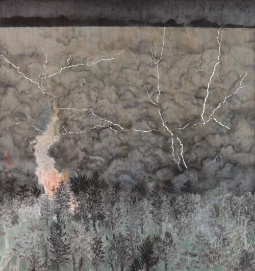 青年博士们在创作中展现出鲜明的创新意识。徐浩月的《青影双境》融合水彩技法与传统笔墨,虚实之间尽显水之灵动;陈泽谦的《天鼓》以潮白河为灵感,用香烫技法呈现雷雨交加的场景,突破传统山水画的表现边界;周书杨的《云烟共晚归》以俯视角度构建水天一色的渔村图景,通过水墨晕染营造人与自然和谐共生的意境。这些作品既扎根传统,运用勾皴点染等经典技法,又大胆尝试新材料、新视角、新题材,让中国画在当代语境中焕发出新的生命力。