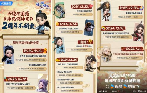 12月18日,《师兄啊师兄》正式开启两周年不断更庆典。一部动画能够实现 730 天稳定更新,背后既离不开制作团队精益求精的创作定力,更离不开粉丝群体长久以来的热忱支持。《师兄啊师兄》与粉丝并不是单纯的动画和观众的关系,两者一直以来都是执手共生的双向奔赴。本次两周年庆典,《师兄啊师兄》秉持着一贯宠粉的原则,在线上线下都做足了排面,不仅整理了以往粉丝二创的佳作,带领观众重温两年相伴的温暖记忆,也策划了跟粉丝面对面、满足粉丝心愿、全城霸屏共同跨年等诚意极强的互动。于《师兄啊师兄》而言,两周年的意义从来不止于一部动画的成长,更在于和粉丝共同度过的羁绊时光。而这份双向奔赴的情谊,也将成为作品持续前行的底气,陪伴观众走过未来的每一个周年。