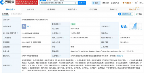 深圳云适骑射体育文化传播有限公司成立于2024年10月,法定代表人为赵飞,注册资本750万人民币,经营范围包括体育赛事策划、体育竞赛组织、信息咨询服务等。股东信息显示,该公司由李杰、于适分别持股52%、48%。