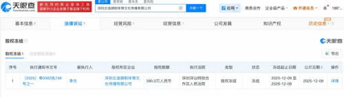 天眼查天眼风险信息显示,近日,李杰新增一则股权冻结信息,股权所在企业为深圳云适骑射体育文化传播有限公司,冻结股权数额390万人民币,冻结期限为3年,执行法院为深圳深汕特别合作
