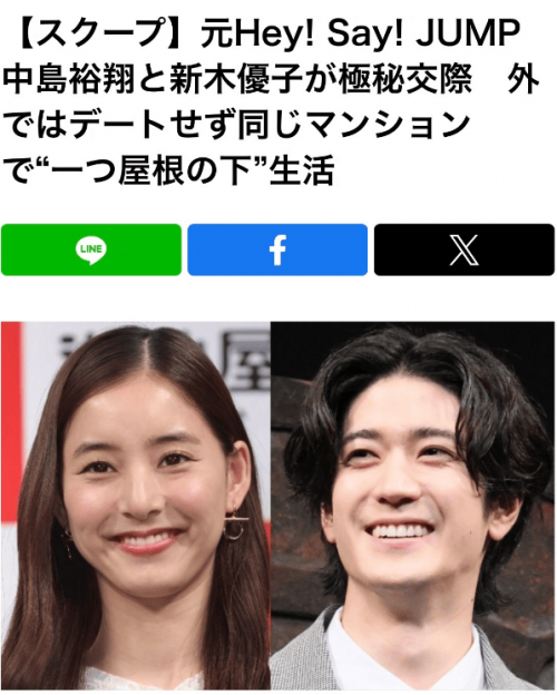 据相关媒体报道,演员歌手中岛裕翔和新木优子正在热恋中,知情人士透露新木优子在今年夏天搬进了中岛楼上的公寓,开启了“半同居”的生活。对此,又相关媒体就交往及结