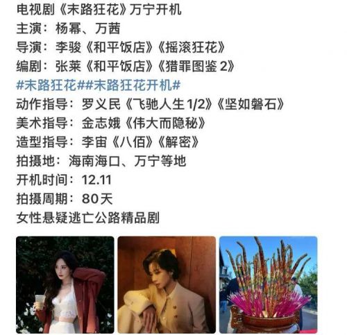 休完假,杨幂立刻飞去海南进组,与万茜合作新剧《末路狂花》。