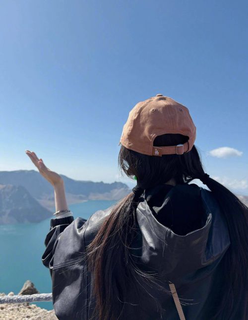 她站在天池前眺望远方,双马尾随风摆动,背影干净利落。
