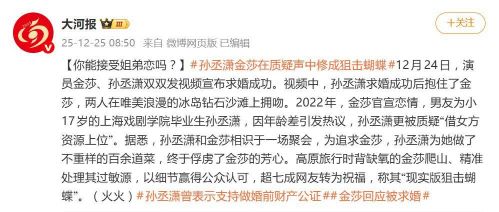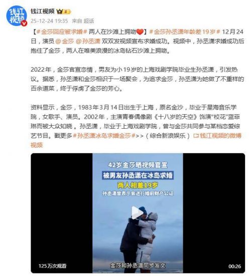 12月24日,演员金莎与男友孙丞潇双双发布视频,官宣求婚成功。这则消息瞬间冲上热搜,让一段曾因巨大年龄差而备受争议的恋情,以最浪漫的方式完成了“口碑反转”。