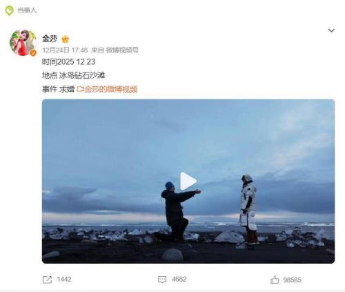 与场景的极致浪漫相比,金莎的官宣文案却显得异常“极简”——仅用14个字标注了“时间2025.12.23;地点冰岛钻石沙滩;事件求婚”。没有煽情长文,只附上现场视频,这种反差反而引发了更多关注。她在后续采访中透露的心态也颇为淡然,表示“比起急办婚礼,更想携手看风景”,暂未透露具体婚期。