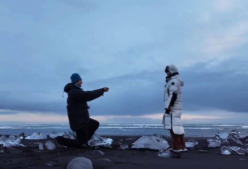 视频中,25岁的孙丞潇在冰岛钻石沙滩单膝跪地,以绚丽的极光为天幕、晶莹的冰川为背景,为42岁的金莎献上戒指。求婚成功后,两人在唯美场景中深情拥吻。整个场景被网友一眼认出,灵感源自电影《白日梦想家》,堪称电影照进现实,被戏称为“顶配求婚模板”。