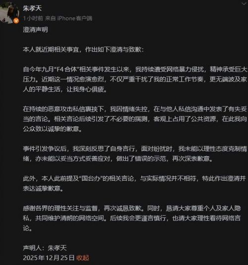 朱孝天道歉了!