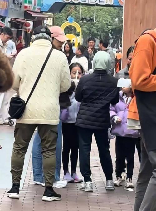 圣诞节的广州南沙万达广场,郭晶晶头戴粉色棒球帽,身穿棕色外套混在人群中。三个孩子围着父母叽叽喳喳,大儿子霍中曦11岁,身高快到妈妈肩膀,两个小女儿穿着同款紫色羽绒服。