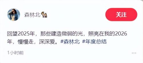 在12月26日,森林北在自己的社交平台上晒出一段视频,还配文:回望2025年,那些建造微弱的光,照亮在我的2026年,慢慢走,深深爱。在这一年当中,森林北好像有了新的规划,不再执着于和汪峰的爱情。