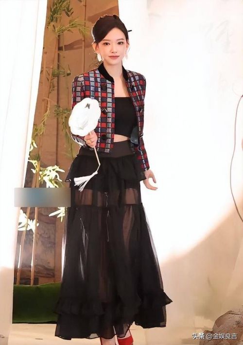 她穿得不像娜扎那样扎眼,而是穿了一件全裹的小坎肩,颜色也是很老气,里面搭配着露脐短装,下半身搭配着黑色半身裙。