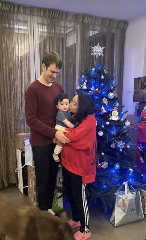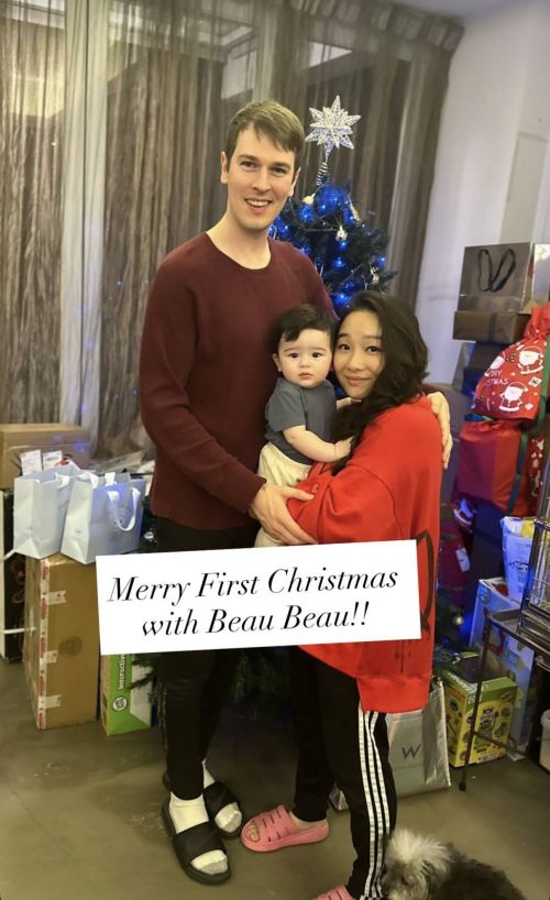 一家三口的合照很温馨,梁静曦抱着儿子,亲吻着儿子,丈夫在另一边呵护着妻儿。梁静曦的儿子着实抢镜,他是混血,也就半岁,长得很可爱,脸蛋胖嘟嘟的,眼睛很大,看起来很像梁静曦的丈夫。虽然他还不懂事,一脸懵懂地看着镜头,可是这样才显得又呆又萌。混血儿子抢镜,梁静曦的外国丈夫更抢镜,不只是因为帅气,更是因为身高出众。之所能一眼就判定梁静曦家中的圣诞树有两米,那是因为有梁静曦丈夫作为参照,其丈夫的身高至少在1.95米,几乎与圣诞树同高了。正是因为太高了,一家三口合照的时候,他更像个巨人,梁静曦实际上才到他的胸膛位置。