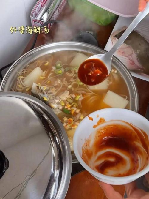 在烘焙食物的过程中,外婆精心准备了一锅充满韩国风味的海鲜汤,其口感异常鲜美。
