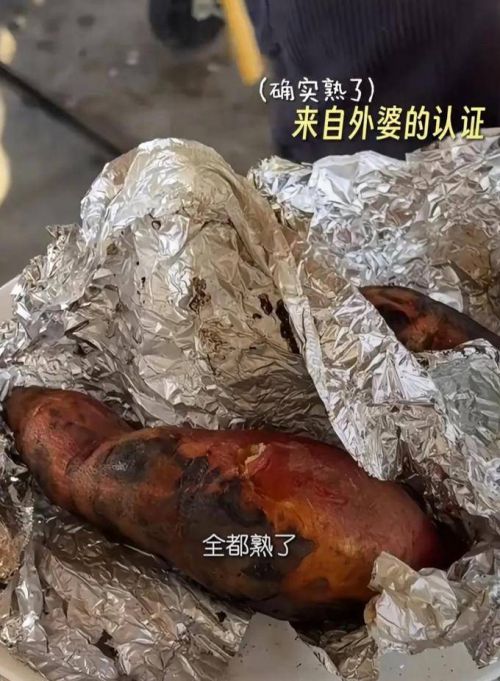 将番薯清洗干净并裹上锡纸后,放入炭火中进行烘烤。