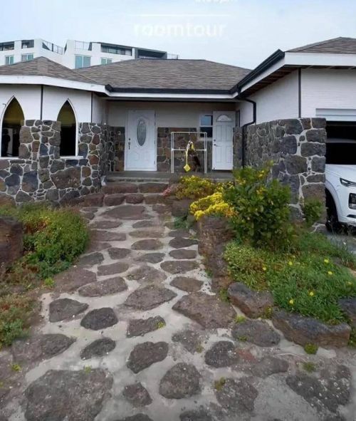 那栋别墅的外部景色真的很迷人,阳光直射到门前,庭院中鲜花盛开,给人一种宁静和舒适的感觉。