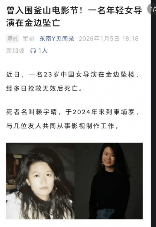 最近,23岁中国女导演赖宇晴在柬埔寨坠楼身亡,她坠落前约1小时被带入出租屋,楼上传出交谈声后她突然从高处坠落,引发舆论对事件关键1小时行踪的强烈质疑。
