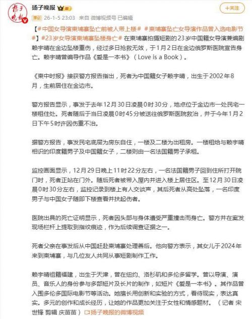 一桩发生在柬埔寨金边出租屋的坠楼事件,让一位年轻中国女导演的生命戛然而止,也留下了重重疑云。1月5日,柬埔寨警方证实,23岁的中国籍女导演兼编剧赖宇晴于去年12月30日凌晨坠楼,经数日抢救无效身亡。其父已赶赴柬埔寨,并向警方表示女儿于2024年来柬,与友人从事短剧制作工作。