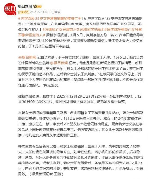 一桩发生在柬埔寨金边出租屋的坠楼事件,让一位年轻中国女导演的生命戛然而止,也留下了重重疑云。1月5日,柬埔寨警方证实,23岁的中国籍女导演兼编剧赖宇晴于去年12月30日凌晨坠