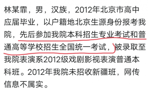 查一下当年中戏入取分数线和林某当年的高考成绩就知道了,或拿出来当年的录取通知书。 不是招收的新疆班,是以新疆的户口进的中戏 占有了新疆一个,应该入学有才华孩子的名额,中戏说没招新疆班,究竟谁在说谎,都拿出实锤证据,不是拿不出来,我看是不敢拿出来吧,