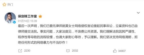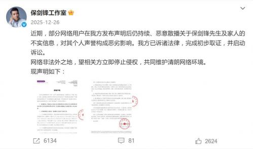 面对如此猛烈的指控,保剑锋工作室的反应堪称“雷霆速度”。同日下午,工作室发出“最后一次声明”,全盘否认出轨、隐婚等所有指控,并亮出法律武器——已正式委托律师就黄慧颐的网络侵权言论提起民事诉讼,立案材料已提交法院。“事实问题,大家法庭见,不浪费公共资源。”态度强硬,不留丝毫转圜余地。据悉,这已是保剑锋方自2025年12月以来的第三次声明及法律行动,但黄慧颐此前称从未收到律师函,双方各执一词,陷入罗生门。
