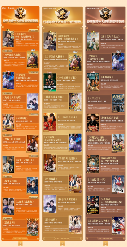 其中,“年度十大老铁最爱短剧榜”TOP3花落《顶级偏爱!妈咪,我找到爹地了》《万里江山入我怀》《全民诡异:开局掌握零元购》;“年度十大商业价值短剧榜”TOP3分别为《顶级偏爱!妈咪,我找到爹地了》《万里江山入我怀》《小小球神不好惹》;《我在荒年当女帝》《全民诡异:开局掌握零元购》《山海奇缘》则斩获“年度十大老铁最爱漫剧榜”前三名。