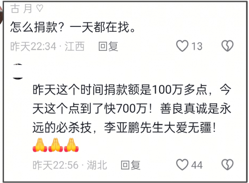 而对比李亚鹏透露过去12年的募捐金额,网友的力量真的无穷大。他表示之前十几年募捐了数百万善款救助了数百位儿童,而这短短几天就要破千万了,捐赠者数额从20元到几万元不等,有的还直接捐赠了几天工地工资,都很热心。