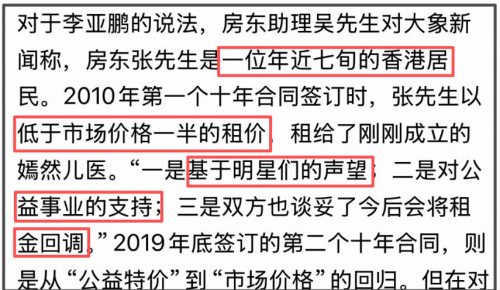 在李亚鹏曝光房租翻涨一倍事项后,房东承担了较大的舆论压力。而后,有记者采访了房东,称房东是一名快70岁的香港人,当年的500万租金就是低于市场价格一半,打折一是因为明星声誉,二是支持公益,三是双方谈妥会恢复原价,而今就是回归市场价。面对质疑,他也表示不能因为公众人物做慈善就指责他无理,租房是是你情我愿的市场行为。