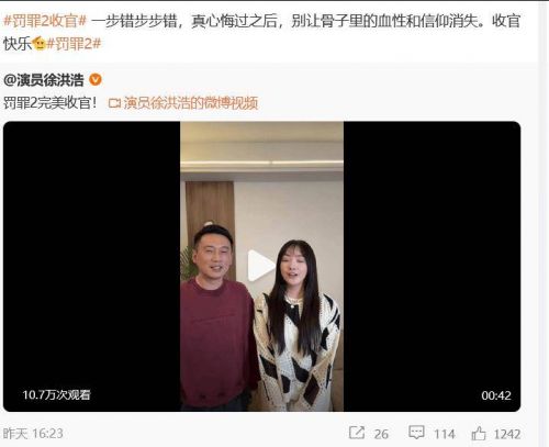 徐洪浩带着妻子刘晓洁发视频告别。刘晓洁感谢观众的支持与喜爱,徐洪浩则先是道歉自己这次没演好人,下次争取努力演个好人。