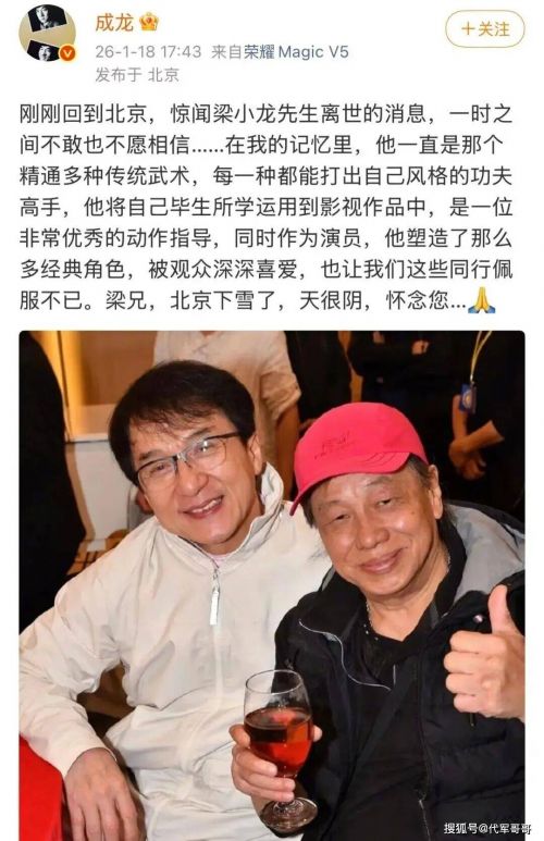 消息传开后,影视圈掀起悼念热潮,昔日好友纷纷发文致哀,诉说不舍之情。成龙在微博发文感慨“一时之间不敢也不愿相信”,回忆梁小龙精通多种传统武术,既能打出独特风格,又能将毕生所学融入影视创作,是值得敬佩的同行与高手。