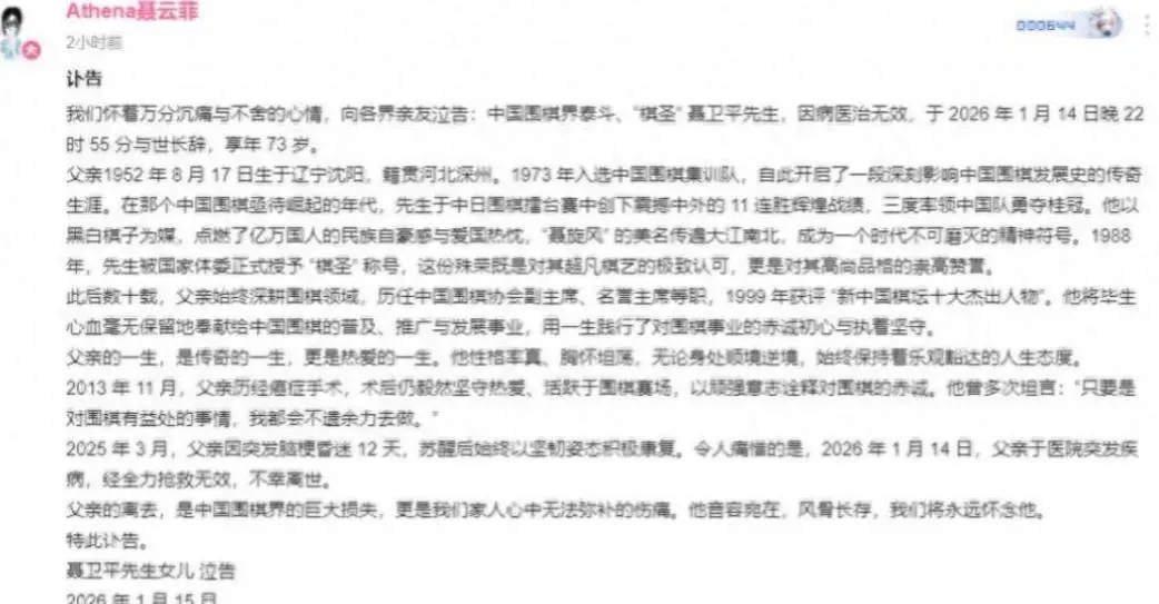 这份丰功伟绩一下子就在国内火了起来,但是就在1月15号的早上,聂老的女儿突然在自己的社交平台账号上发出了一条讣告。