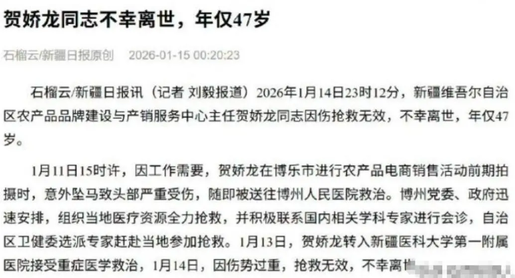 才47岁的贺娇龙明明有着那么好的未来,但是却发生了意外,在马年的第一个月,从马背上摔下来,经历了几天的全力抢救后还是离开。
