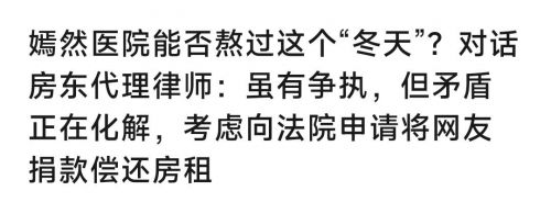 房东那边委托的律师在接受采访时甚至对外表示,他们准备找法院协调,看看能不能把网友给嫣然天使儿童医院的上千万捐款,拿来充抵拖欠的房租。