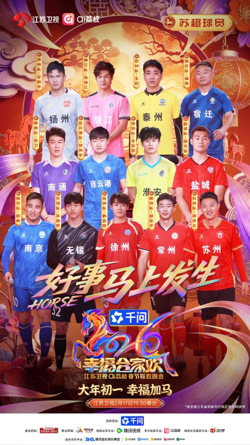 马跃新春福满盈,阖家欢乐贺新春!由“千问app”独家冠名的《幸福合家欢·2026江苏卫视ai荔枝春节联欢晚会》今日正式官宣首波嘉宾阵容! 刘宇宁、蒲熠星、R.E.D、信(苏见信)、小鬼-王琳凯、魏翔、印小天、喻言、张峻豪、张卓尔、“苏超”球员、方言合唱团正式集结。这份涵盖实力歌手、跨界新秀、体育健将与地道乡音的年味儿“菜单”,直接把春节的期待值拉满!当金曲唱将遇上实力新生代,当跨界艺人碰撞春晚舞台,当绿茵豪情融入万家灯火……这桌精心调配的“团圆饭”,将烹饪出怎样的新春风味?