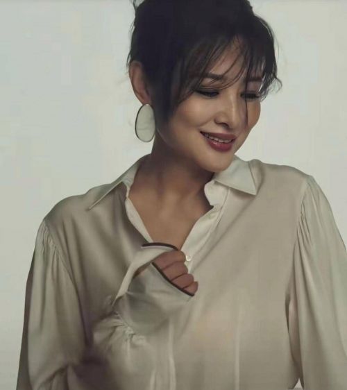 再看看拍摄写真照的周涛,非常轻松慵懒的丝绸小衬衣,搭配上潮流十足的大耳坠,而点睛之笔的浅红色口红,让自带笑眼的周涛看起来更加温柔娇媚,