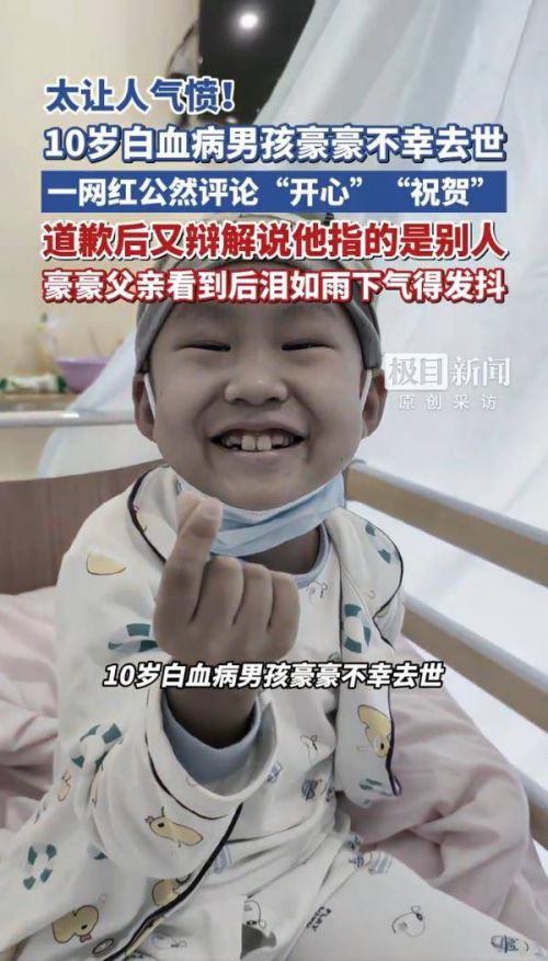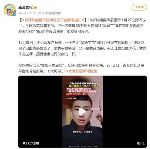 事件起因于1月27日,贵州白血病男孩豪豪的离世。这个从4岁起就与急性髓系白血病抗争的孩子,经历了17次化疗、2次骨髓移植,他那句“王子请恢复健康,永不复发”的恳求曾让全网心疼。他的去世,引发了无数网友的自发悼念。然而,就在这片悲伤的氛围中,拥有快手88万、抖音十几万粉丝的网红“吴新宇”却跳了出来,不仅在其相关视频下留言“太爽了”、“祝贺你”、“真开心”,更专门发布视频冷血宣称:“我听说那个白血病豪豪走了,跟我有啥关系,又不是我造成的。有人让我给他送花,我凭什么送啊,搞得像全世界欠你的一样。”