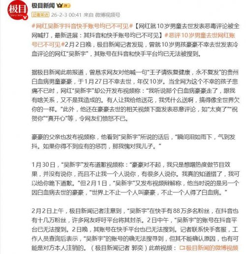 据2月3日报道,一则消息让不少愤怒的网友暂时舒了口气:曾对不幸去世的10岁白血病男孩豪豪发表恶毒评论的网红“吴新宇”,其抖音和快手账号均已无法被搜到。这场因&ld