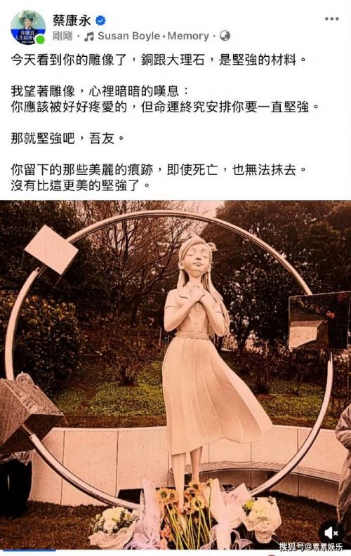 大S的雕像揭幕结束,令人感动,不舍,惋惜!蔡康永送别完挚友,在个人账号再次发文缅怀大S,说大S应该被好好疼爱的。康永哥:今天看到了你的雕像了,铜跟大理石,是坚强的材料。我望着雕像,心