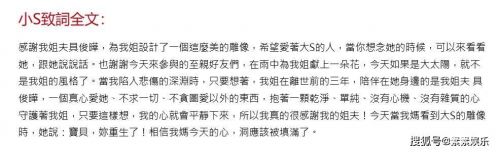 小S在姐姐的雕像揭幕仪式上致词,感谢姐夫具俊晔陪伴大S最后3年。一想到这点,她感到无比感谢。